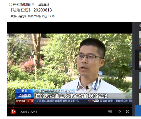 院长钭晓东教授接受栏目参访并进行点评:第一,宁波市江北区人民法院的判决,充分体现了在法制运行过程中,法律方法在时代变迁中的变化,这其中不变的是时代对法治运行和规则功能的展现。第二,是对“远亲不如近邻”的生动诠释,是中华传统文化所倡导的慈孝、和谐邻里的典型体现,引领了道德新风尚。第三,小故事折射大道理,这个调解兼顾了村集体与老徐等各方利益,赢得社会各界的充分肯定,达到法律效果与社会效果的统一。第四,是对社会主义核心价值观和法治正能量的弘扬,是法律对善举正向激励的兑现,使有德行的善者能从善行中得到肯定与回报,融通天理、国法与人情,唯此,善行将更持久,真正实现良法善治。