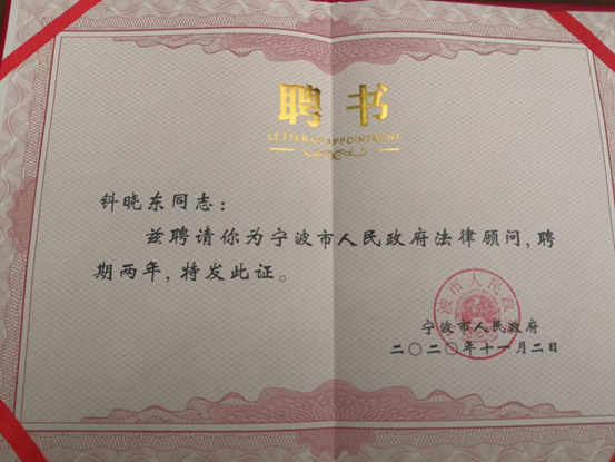 2020年11月4日,在宁波市行政会议中心召开宁波市法治政府建设暨综合行政执法改革推进会,市司法局励健局长、市城管执法局郑一平局长就法治政府建设和综合行政执法改革作发言。市长裘东耀、常务副市长陈仲朝、市政府秘书长朱金茂为新一届市政府法律顾问颁发聘书,六合彩