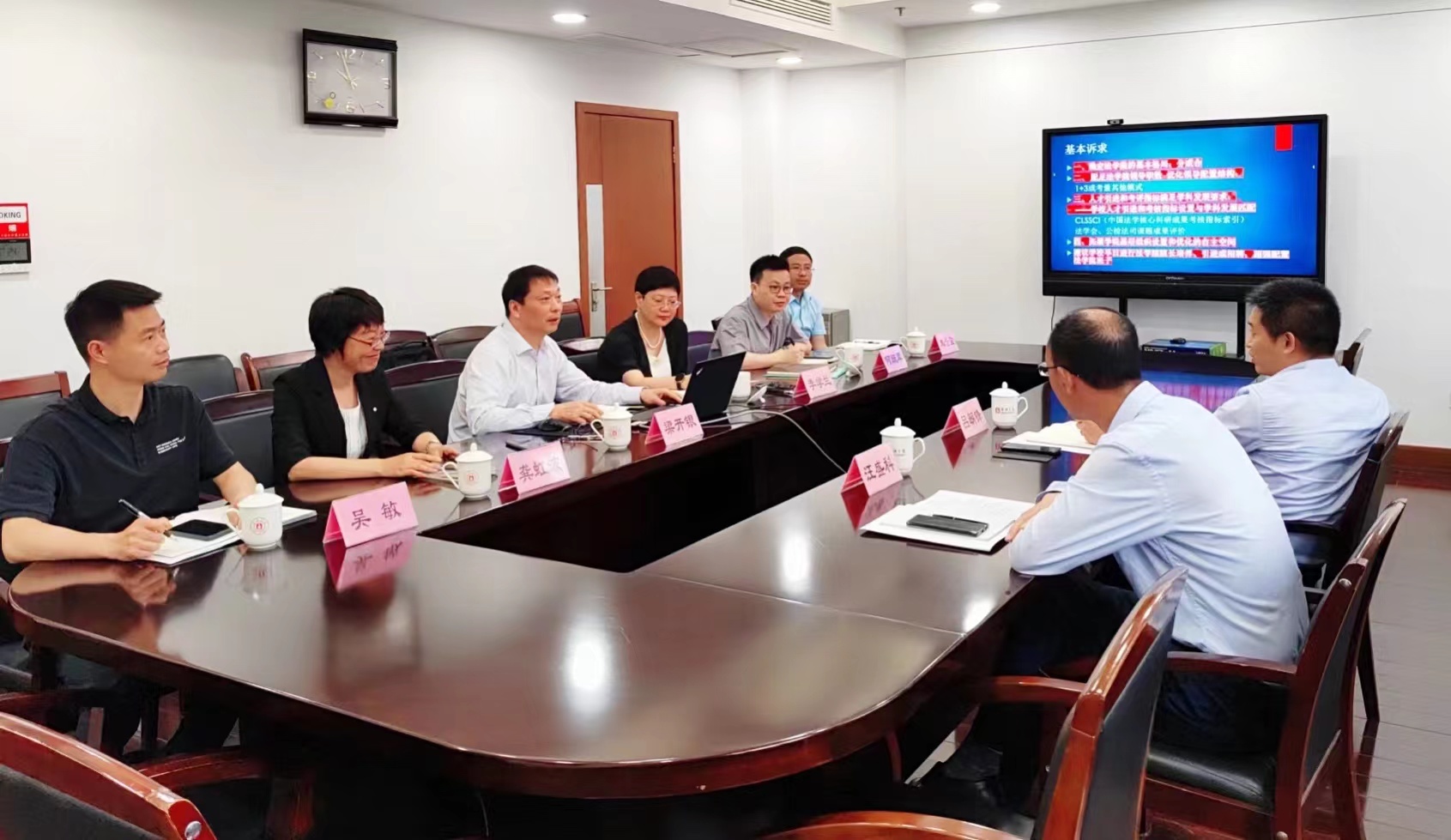 院长梁开银介绍了学院的总体情况,重点围绕学院发展的基础、学院发展面临的挑战、学院发展的思路谋划三方面,详细汇报了学科建设、科学研究、师资队伍、人才培养等维度的成就、挑战与展望。其他班子成员就学院党建、学院共同体文化建设、社会服务、系所工作开展等主题进行了补充介绍。