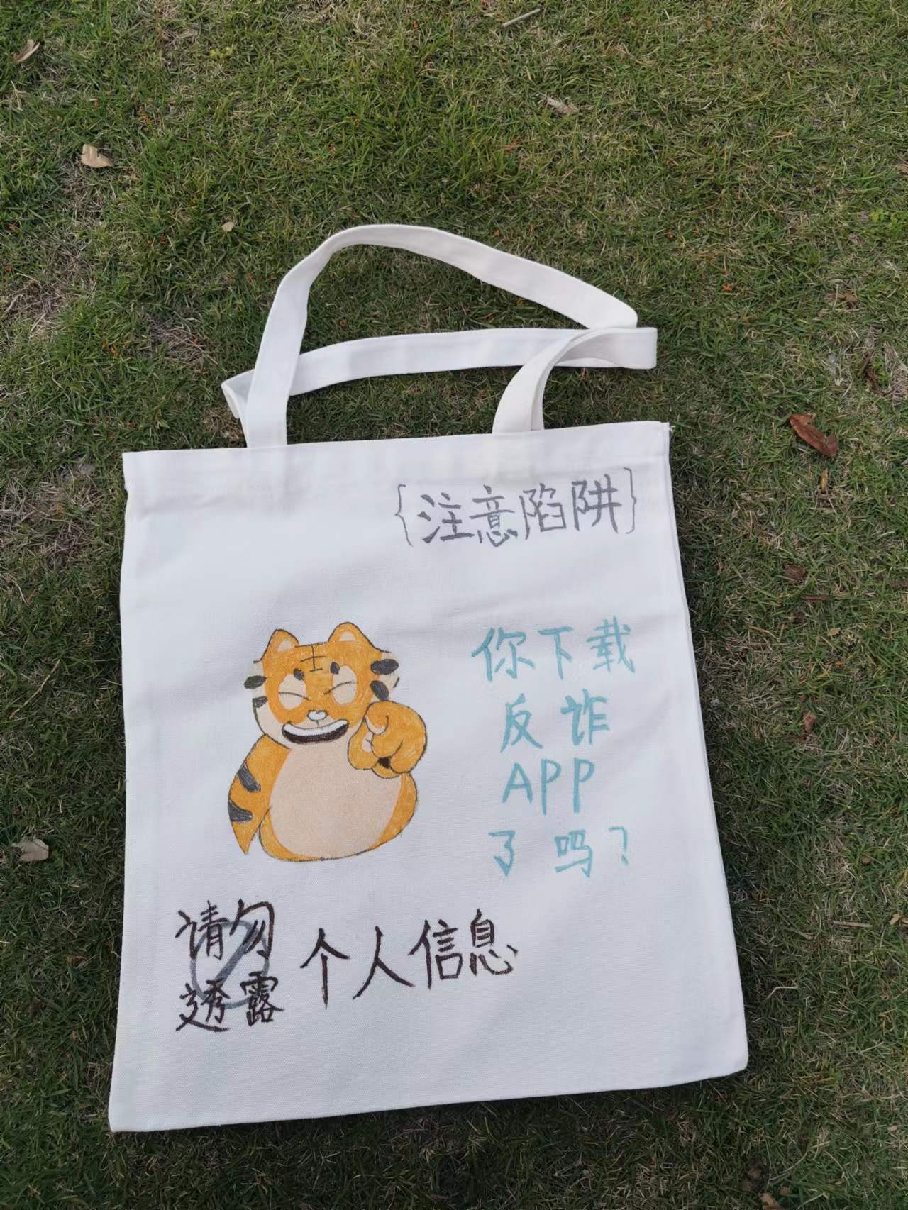 绘制活动结束后,同学们受益匪浅。2022级的陈嘉煜同学说:“创作结束,恰是宣传反诈知识的开始。我希望能够通过帆布包的日常使用,在警示自己防范诈骗的同时,也给身边的同学、亲友带去正面影响。