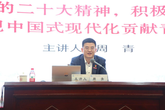 11月16日,校党委委员、党委宣传部部长周青在真诚图书馆报告厅以“深入学习党的二十大精神,积极投身创新创业,为实现中国式现代化贡献青春力量”为题为六合彩